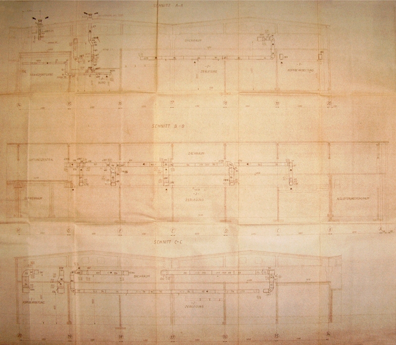 ZuluftKanal wird 2x über StichKanäle durch eine Sandwich-PaneelDecke in den ZerlegeBereich im