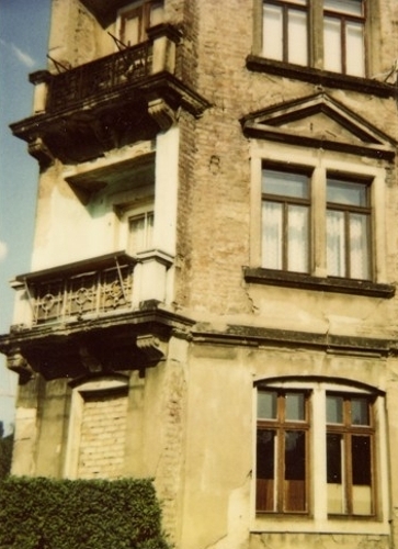 7. Aufbau der Geländer-Pfosten - 3-teilige Pfosten (Basis, Stütze, AbdeckPlatte) ebenfalls aus SB mit SandsteinImitat-VorsatzSchichten an allen SichtFlächen - zur Stabilisierung der GeländerPfosten sind die AbdeckPlatten mit dem angrenzenden Wandmauerwerk verbunden - die vorhandenen 2 Balkon-Geländer wurden von einer Schlosserei aufgearbeitet, fehlende Teile erneuert und oberflächen-behandelt - wichtig: dabei wurde die GeländerHöhe auf das nach SächsBO § 38 (3) geforderte Maß von >= 80cm gebracht Der GeländerAufsatz war so gestaltet, das BlumenKästen verankert werden könnten, um mit einer RankBepflanzung die offene BalkonEinsicht zu verhindern Damit sollte das Anbringen von HolzTafeln o.a. SichtSchutz-Elementen vermieden werden, |