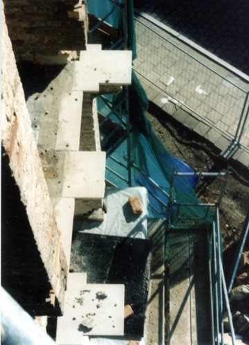 6. einsetzen der neuen Balkon-GrundPlatte - die KranMontage ging relativ unkompliziert vonstatten - da die Konsolen keine statisch-wirksamen TragElemente mehr sein sollten, war das Mörtelbett nur im Bereich des Mauerwerks aufgebracht worden, im KonsolBereich entstand so eine HohlFuge |