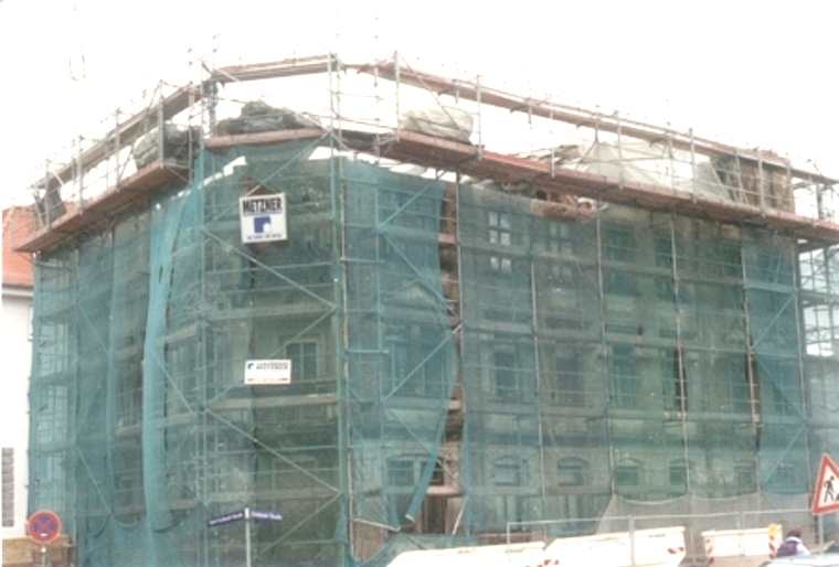 2. TeilRückbau der vorhanden Rüstung - Einrüstung des Gebäudes; - ich zeige dieses Foto deshalb, weil auch bei den RüstArbeiten durch umfangreichen Rückbau und anschliesende Wiederherstellung erhebliche bKosten entstanden - noch ein Detail: auf der oberen RüstEtage vorgelagert sind WärmedämmZiegel und zwar mit Folien aufwendig geschützt gegen Nässe > an solchen Details erkennt man gute BauFirmen (hier BU METZNER) |
