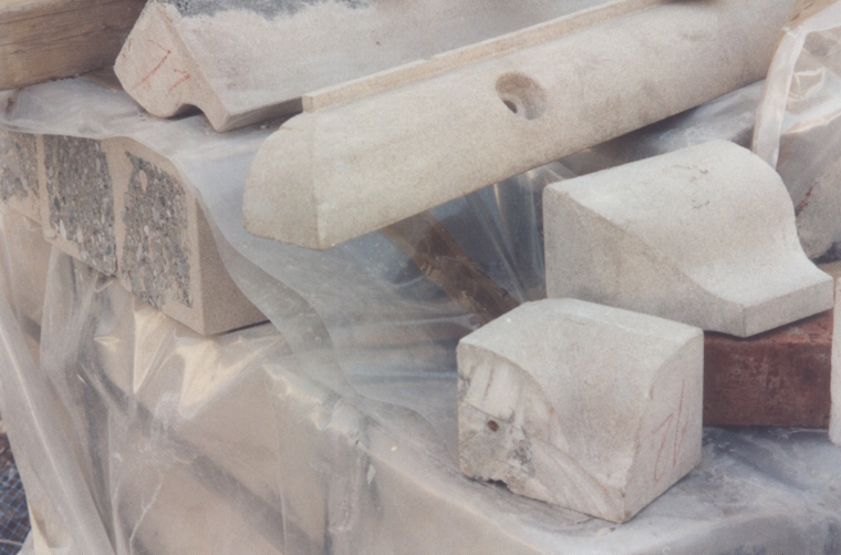- neu erforderliche Sandstein-Bauteile bei diesem BauVorhaben wurden überwiegend aus SandsteinImitaten hergestellt - diese SandsteinImitate bestehen aus einem StahlBeton-Kern mit SonderBeschichtungen im sichtbaren Bereich Material: COMPAC/COMPAFIL-Steinnachbildung Rezeptur: gelber Sandstein handwerkliche Bearbeitung: geschliffen/gewaschen > das folgende Foto zeigt angeliefertes Material, dabei sind linksseitig die StirnFlächen zweier Geländer-Stützen sichtbar, wo man ganz gut die StahlBeton-KernSchicht und die MantelFlächen mit dem SandsteinImitat sehen kann > im konkreten Fall handelt es sich um Produkte der Firma COMPAC-Stein GmbH - soweit mir bekannt wurden die Bauteile selbst im Raum Bodensee /Süddeutschland hergestellt und in zwei Phasen per Schwerlastzug angeliefert (übrigens, ums abladen + lagern musste ich mich dann selbst kümmern, ausserdem hatte ein Schwerlastzug den Fussweg "zerpflügt" weswegen ich mit dem Ordnungsamt Probleme bekam) - die Konsequenz: sehr genaues Arbeiten bei der Erstellung der VorfertigungsUnterlagen, denn NachFertigungen waren so gut wie ausgeschlossen > der Formbau hätte neu kommen müssen, der Transport über die weite Strecke, der Baufortgang speziell der RüstungsAbbau wäre über Monate blockiert gewesen und letztendlich durfte auch nichts übrig bleiben > ein derartiges Unterfangen macht man wohl nur einmal im Leben mit - aus Gründen die hier nicht weiter erörtert werden sollen (wieder eine lange Hick-Hack-Liste), kam abschliessend auf alle SandsteinBauteile (natürliche + Imitate) ein DeckAnstrich (Keim-Farben) Der ImitatEinsatz ist trotzdem zu rechtfertigen, denn; > dadurch konnte dasselbe AnstrichSystem wie beim NaturSandstein ohne weitere Vorbehandlung verwendet werden > fraglich ist, ob auch ein BetonElemente-Hersteller die Profilierungen so hinbekommen hätte > hier ist eine echte Sandstein-OberflächenStruktur entstanden (Beton > LunkerStruktur, scharfe KantenGrade etc) |