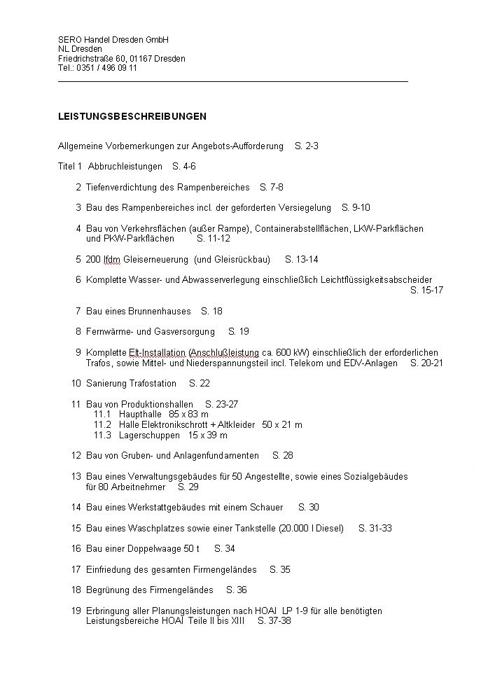 - Abriß aller zahlreich-vorhandener mehrgeschossiger SB-Hochbauten mit teilweise zweifacher UnterKellerung und einem freistehendem GroßSchornstein - GleisRückbau und GleisErneuerung /ein GrundstücksNachbar ist der GüterBahnhof Dresden-Friedrichstadt - Wasser- und Abwasser-NeuTrassierung einschliesslich AbwasserBehandlung und LöschwasserBereitstellungen - einbeziehen einer 110kV Hochspannungsleitung über dem Grundstück in derem Bereich bauliche und damit Nutzungs-Einschränkungen zu beachten sind |