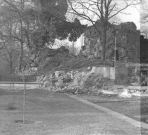 Aufnahmestandpunkt 4 Werksteinfassade an der NW-Seite der Raumgruppe I hinter dem Waschbäreinzwinger, darüber die Brüstung der Aussichtsplattform +7.95. |