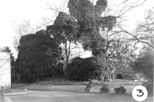 Aufnahmestandpunkt 3 Westteil der Felsenanlage, rechts mit dem niedrigeren Felsenmassiv über Raumgruppe III, durch einen Einschnitt davon getrennt, das zentrale Massiv mit seiner höchsten Erhebung im Bereich des Treppenturmes. Die Felsen sind vollständig von Weinranken überwuchert. |