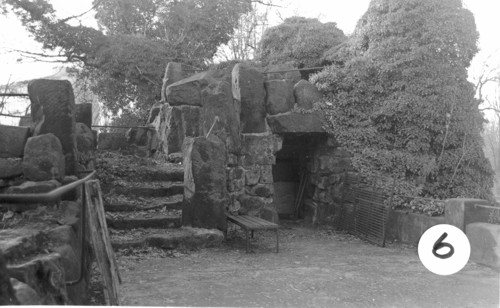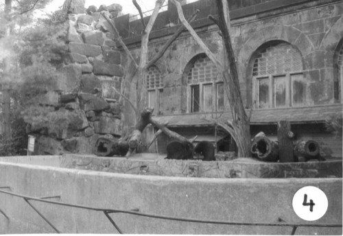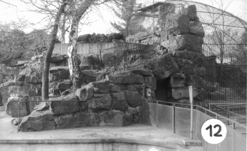 Aufnahmestandpunkt 12 Blick über den Seelöwenteich auf den Eingang zur Raumgruppe II und die Uhu-Voliere |