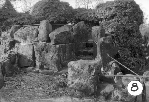 Aufnahmestandpunkt 5 Aufgang zur Aussichtsplattform +7.95 von Südosten, Freitreppe aus unregelmäßigen Sandsteinstufen. Rechts der Einschnitt gegen das benachbarte, nordöstliche Felsmassiv. |